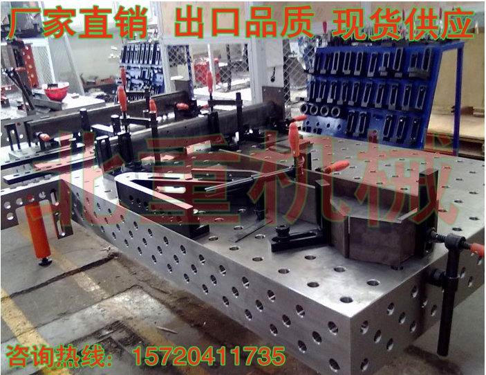 3D多功能焊接工裝臺面采用帶孔格板形式,孔徑有D28D16兩個系列。在高精度的臺面上,每隔100mm均布D28的圓孔或每隔50mm均布D16的圓孔些孔可用于拼接各種功能的定位模塊和夾具。各種功能模塊除臺面外,還有定位塊,直角塊,立柱,任意角度調(diào)整,V形塊,銷栓,各類快速夾具,間隙調(diào)整片及各種輔助模塊。模塊的設(shè)計構(gòu)思巧妙,可以進行各種組合和反復(fù)應(yīng)用。