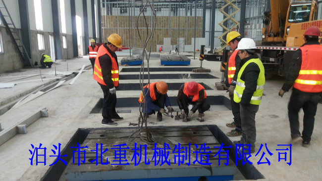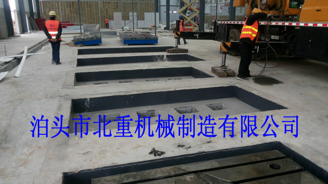 我公司為西門子電機制造的6件2500*4000電機試驗平臺安裝中.電機試驗平臺表面帶有T型槽,方便固定實驗設(shè)備.T型槽工作臺采用預(yù)埋的安裝形式,這樣的優(yōu)點是:1.不會出現(xiàn)平臺在實驗震動下的位移.2.減小震動輻射范圍.3.使試驗平臺的壽命和實驗效果大大提高.