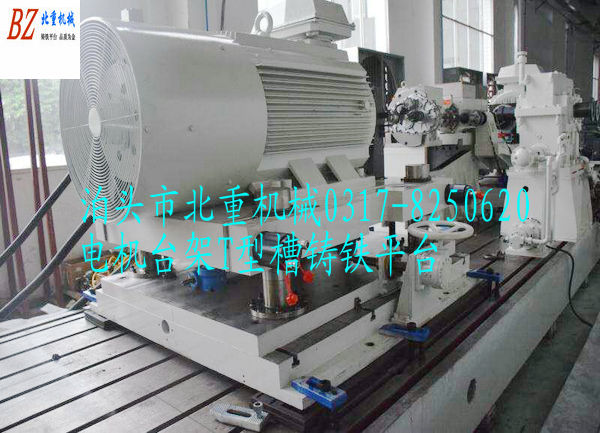 電機(jī)臺架T型槽鑄鐵平臺,T型槽鑄鐵平板工作面都加工有T型槽,中間距為200mm,一般用28t型螺絲,精度為2級。這樣的設(shè)計就是為了把電機(jī)定位在鑄鐵平臺上面,轉(zhuǎn)起來試驗,要得到數(shù)據(jù)等!